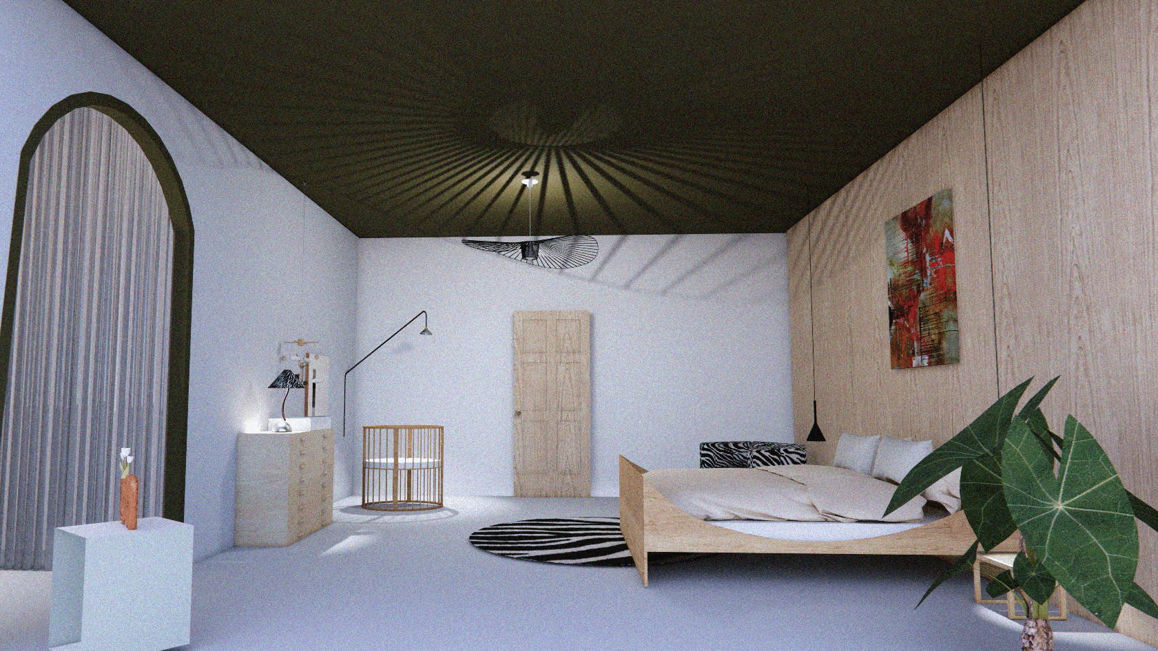 Rummet reflekterer det postmoderne avantgardesmag, hvor der ikke findes faste regler for, hvad der er “rigtigt” eller “forkert”. Farver og mønstre kan virke usædvanlige og uventede, men de er sammensat på en måde, der inviterer til leg og nysgerrighed. Møblerne har en funktionel skønhed, der både er praktisk og æstetisk tiltalende. Dette soveværelse er ikke kun et sted for hvile, men et rum der rummer kvindens mange facetter, både de rolige og de dynamiske. Det er et rum, hvor hun kan finde plads til at være sig selv – uanset hvilken rolle hun påtager sig i det moderne samfund.